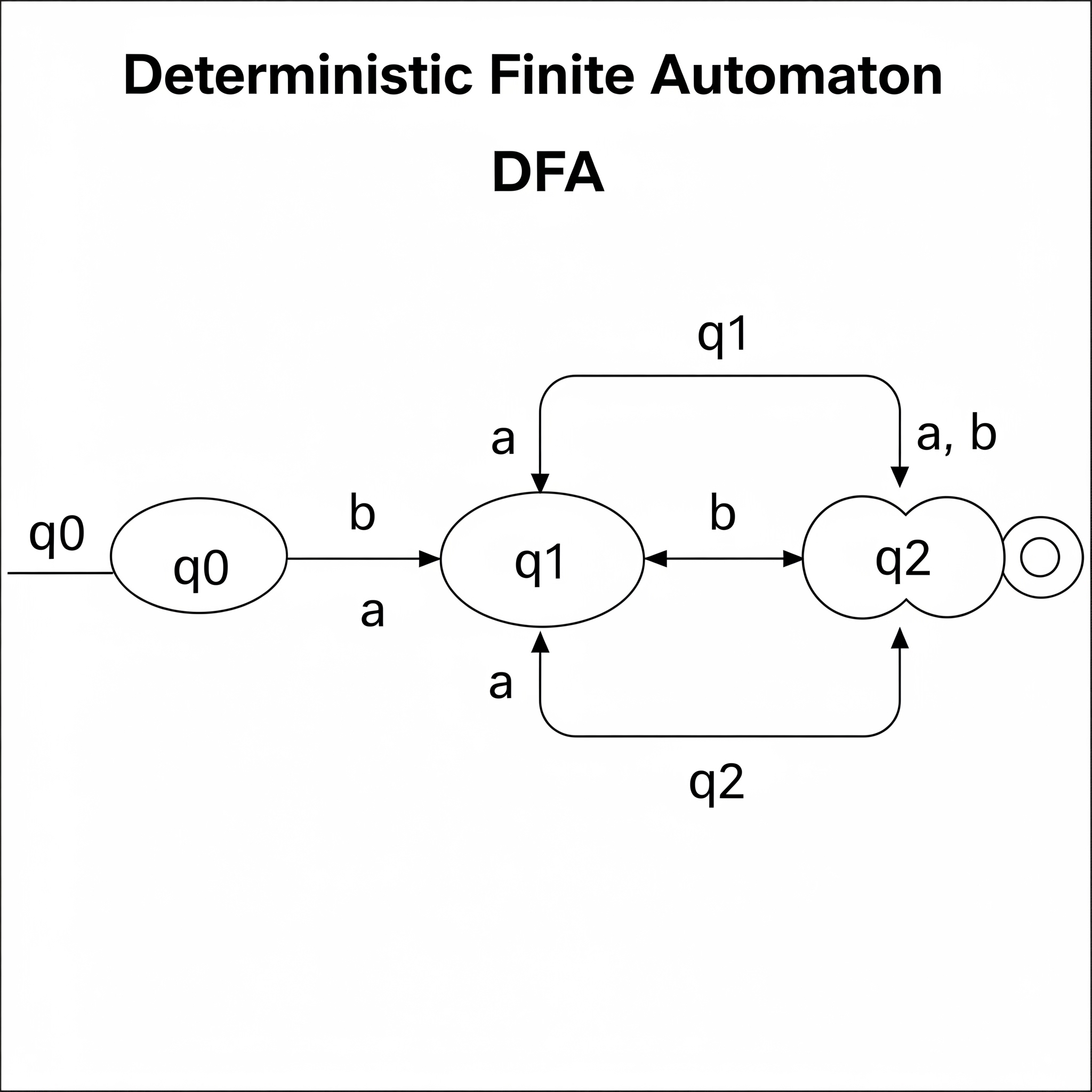 The 'D' in DFA stands for Deterministic. This means the machine is very strict and predictable. For any state and any input symbol, there is only ONE single path to the next state. There is no confusion or choice. It's like a robot that has a fixed, pre-decided instruction for every possible situation.